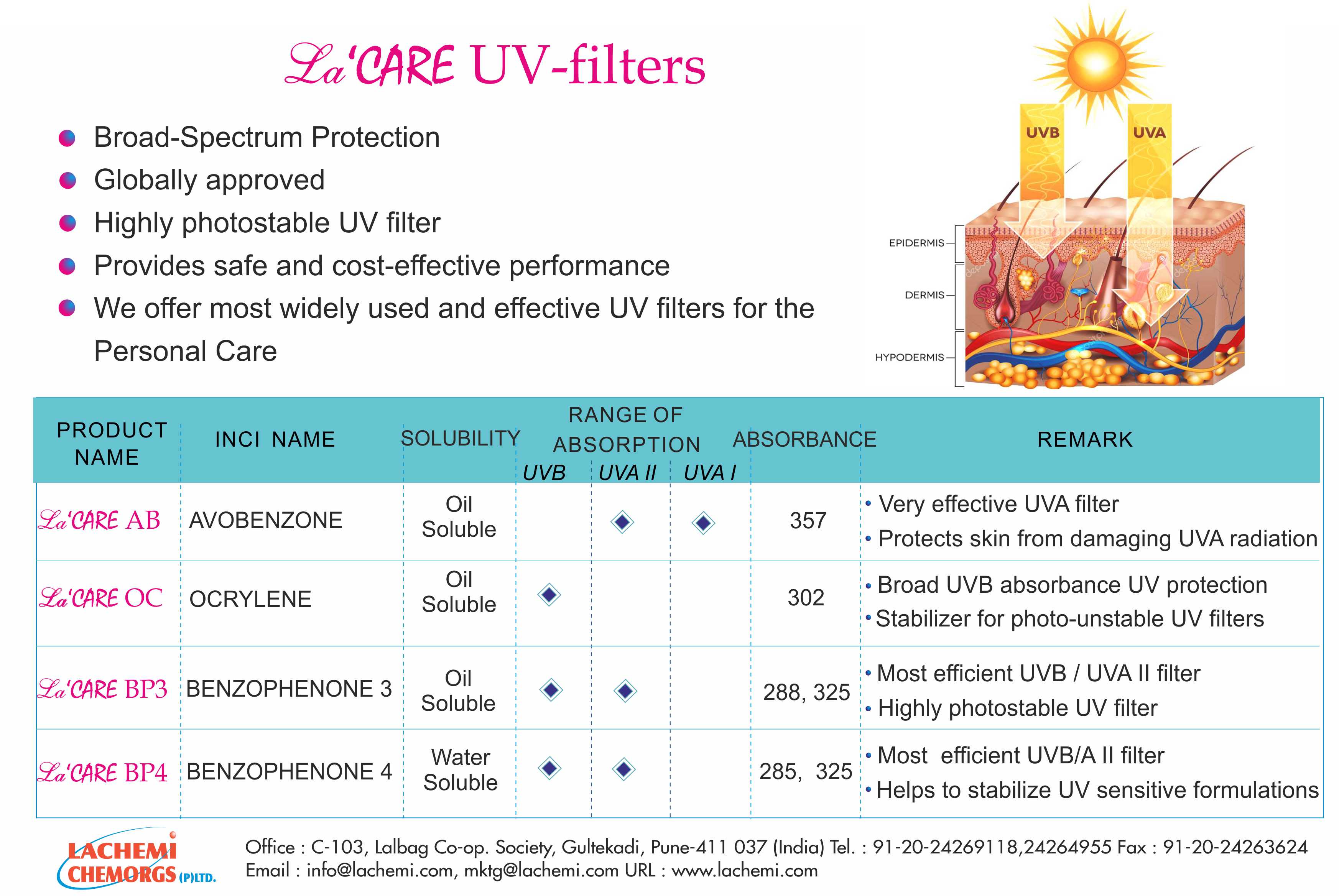 La‘CAREAB acts as a high efficacy oil-soluble UVA filter. Its ability to absorb ultraviolet light over a wider range of wavelengths .It protects against photodamageandpremature aging of skin caused by exposure to UV-A light.